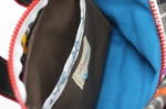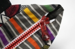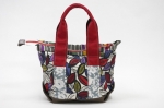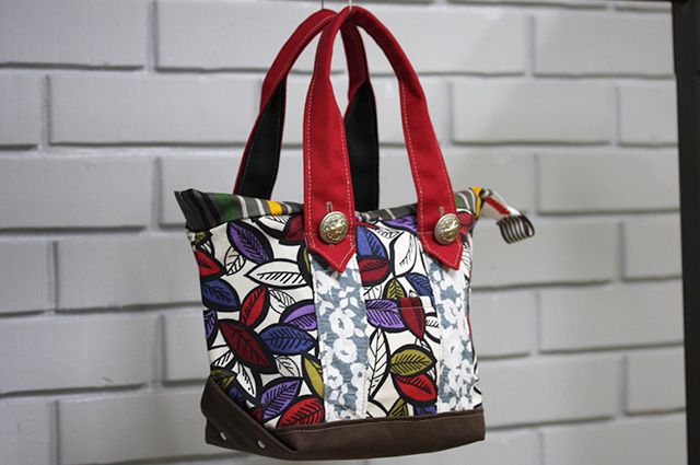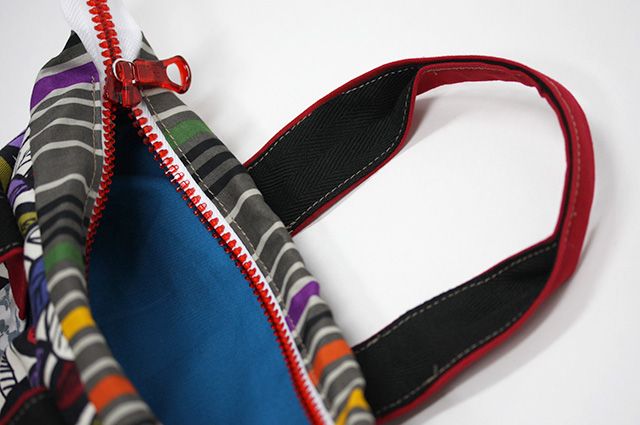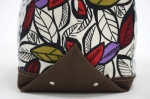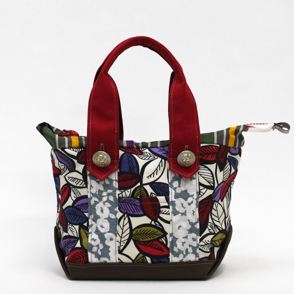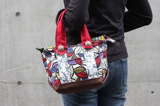 個性的なプリント生地と、クリアカラーのスイス製ririファスナー、アクセサリーのように美しいイタリア製メタルボタンボタンを組み合わせた小ぶりのトートバッグです。