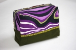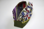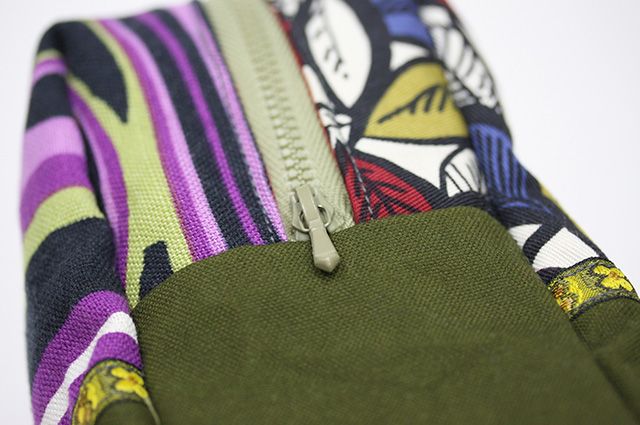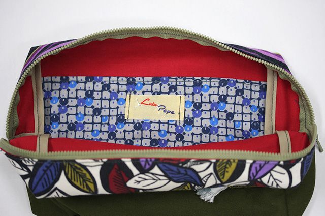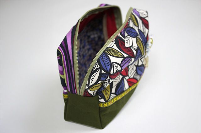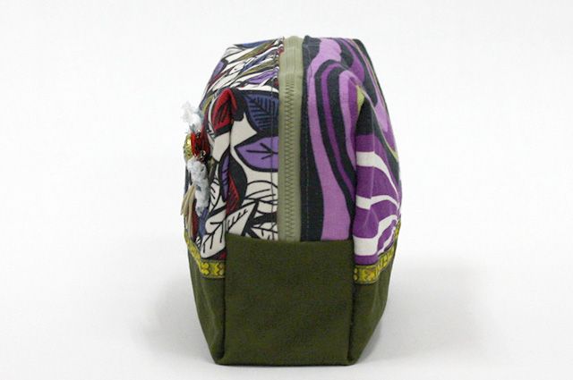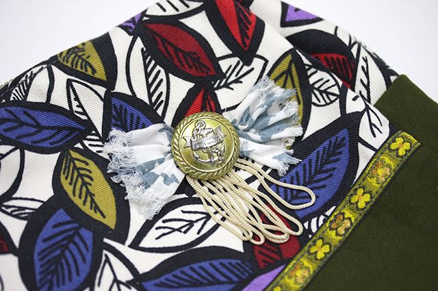 個性的なプリント生地、アクセサリーのように美しいリボンやボタンを大胆に組み合わせたポーチです。
